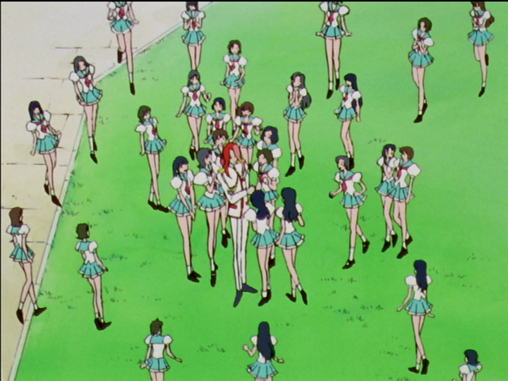 In the recap episode 24, Mitsuru saves Nanami from another rampaging horse. Who set this one loose? Presumably Anthy, because Mitsuru was walking with Nanami and could not have guided the horse. Mitsuru and Nanami end up on the ground. The horse is unperturbed. Students in the crowd keep a safe distance and carry their briefcases in hand (none over the shoulder or clasped by both hands in front), as if not too alarmed but nevertheless ready to flee. Everybody was walking to school; that must be why they are so neatly spread out.