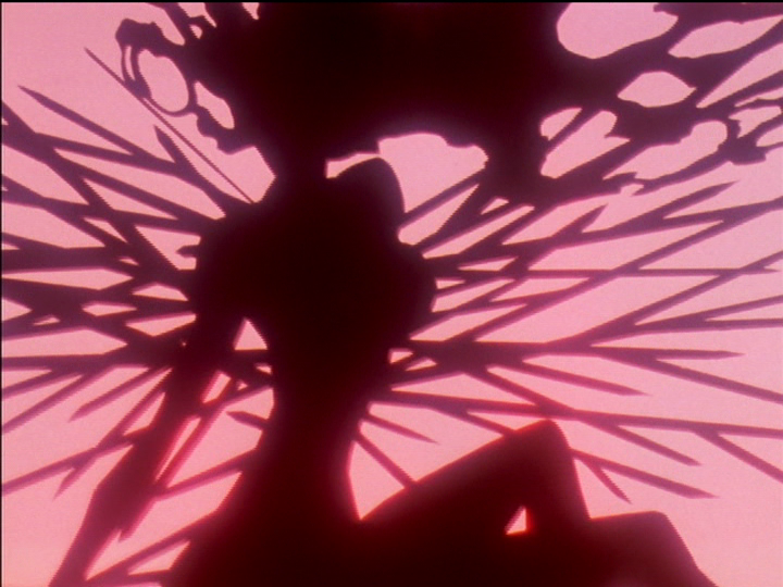 Utena has a sudden vision of Anthy pierced by the Swords of Hatred. Wind blows. Anthy feels the pain of separation from Utena, shown as a pink background. She attributes it to the Swords, that is, to the malice of society. In reality, of course, it is Akio’s malice. Or maybe the pink marks it as Utena’s vision, since Anthy always feels the pain of the Swords (as implied by her correspondence with the Little Mermaid). It ought to remind Utena of little Anthy caught by the Swords of Hatred in the episode 34 version of the prince story.