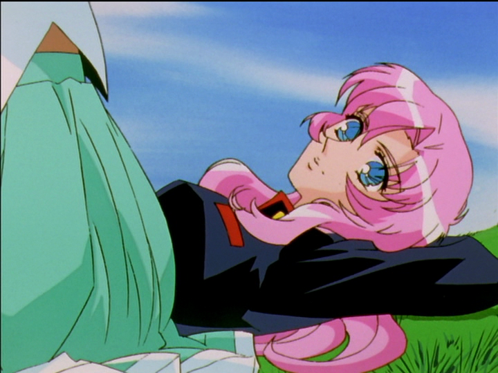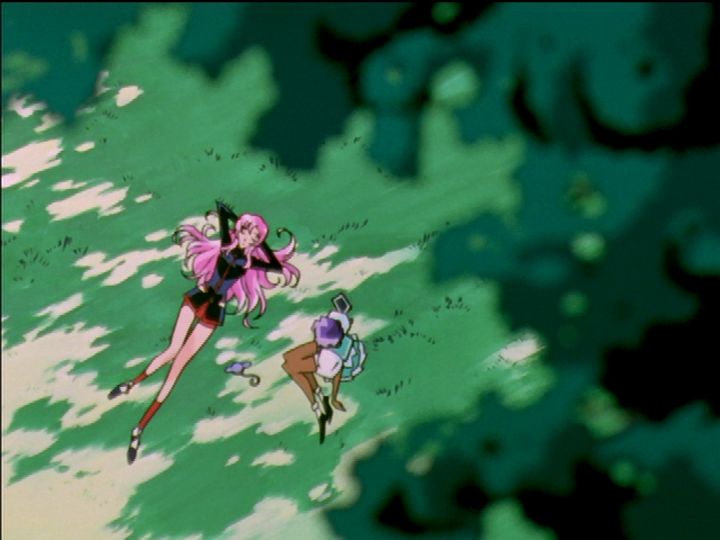 When Utena flops back onto the ground, her breast wobbles are animated. It’s the only example in the series of that flavor of fan service. Her breasts are drawn at the large end of their size range (like many things in Utena, they vary). It is meaningful: It says that Utena is girlish. It is after the Second Seduction, if we can trust the order of scenes at all, and after her period of regret. She is more girlish than ever, and she is not treating her chest as a boy’s chest as she normally does around Anthy. I suspect that being girlish in itself tends to push Anthy away from Utena—it’s immediately after this that Utena has a vision of Anthy pierced by swords. Anthy buys into her appointed feminine role and can’t entirely leave it behind.