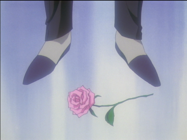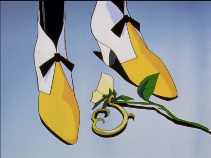Akio’s shoes vary in different images. In the recap to introduce the Black Rose, his shoes resemble Utena’s, partly white and partly dark. Akio’s shoes are dark purple; Utena’s are midnight blue. The two-tone shoes refer to Dios (the day) and Akio (the night). One take is that for Akio they portray his mixed world of darkness and light and his goal of trapping and controlling the light in his darkness, while for Utena they show her mixed nature.