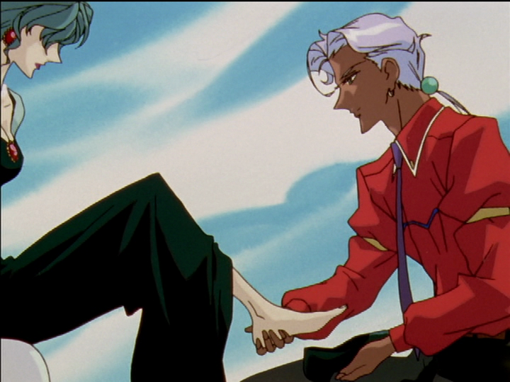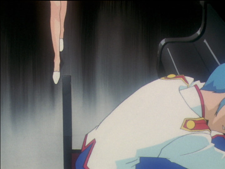 In the two pictures above, Akio lifts Utena’s and Mrs. Ohtori’s feet from the floor. He controls them: They do not have freedom of movement. Nanami’s foot is hurt but stays on the floor except as raised by the heel. Nanami does not become a princess, but her high heels are restricting her movement (even if we can’t see it in the animation). The system of control has its thumb on her. Compare Utena’s lifted heels with Touga, below.