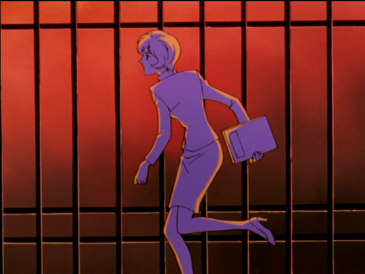 Tokiko runs past the burning building to reach Mamiya. She wears high heels, and her skirt is not slit to allow free movement. She runs awkwardly, which seems to be more due to the constricting skirt than the senseless (opposite of sensible) shoes. Both mean the same: Her freedom of movement is literally constrained, and her freedom in general is metaphorically constrained. She admonishes Mamiya but can do nothing about the situation.