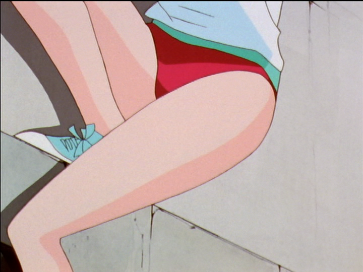 Entering the hotel room of the First Seduction, at first Utena is not at ease. Akio simply waits. As Utena gets used to it, step by step she approaches Akio and lowers herself to the floor, metaphorically subordinating herself to him. Here she feels so comfortable that she bicycles her legs in the air; see watching television. She doesn’t care that she’s wearing a short dress; she doesn’t notice her sexual vulnerability.