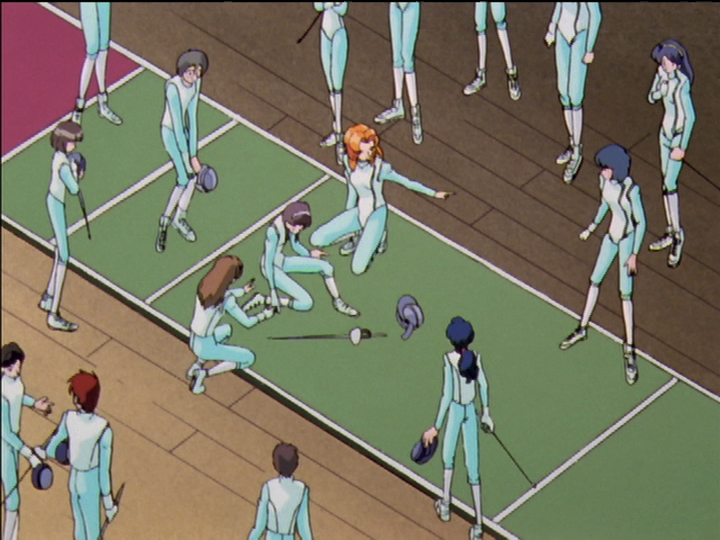 In episode 29, an anonymous member of the fencing club injures her right ankle. It’s presumably an honest sports injury, not an engineered injury like others here. Juri (not Akio) makes sure the injury is treated, and the fencer ends up in a hospital bed. One purpose is to bring Juri into the hospital to show the shadow play. Another purpose is to contrast with the engineered injuries.