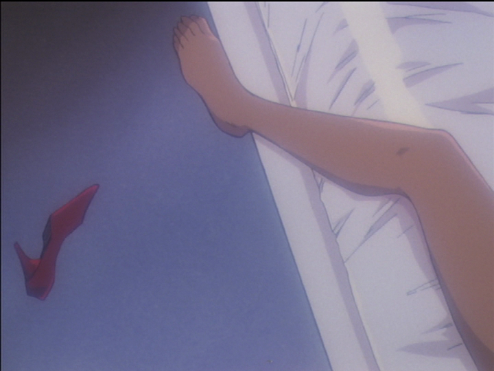 Later in episode 31, Nanami sees Anthy and Akio together and is deeply disturbed. This is Anthy’s left leg; Anthy is captured by illusions. Anthy is wearing nothing, but her red princess dress is on the floor, and the red shoe is part of the princess costume. High heels are supposed to be sexy (personally, I’ve never been able to see that illusion). In the context of a sexy scene, the heels are taller than in the context of drawing Utena’s sword. Her legs are apart to signal sex.