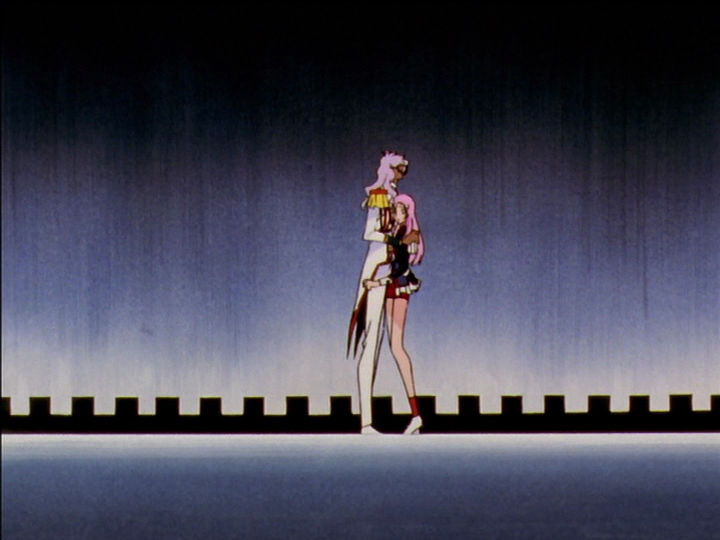 Immediately after this, Akio draws Utena’s sword and turns her into a princess. Wrapping an arm around her back completes his claim of possession; she is in his hand.