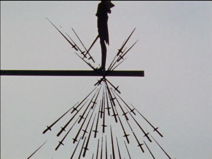 As Akio carries Utena’s sword to the Rose Gate, the Swords of Hatred appear. Akio says that the prince’s sword attracted them. No problem; one of Anthy’s key functions is to be blamed and hated so that Akio is not. Women are to sacrifice themselves for men. Akio stands confidently in place as the Swords converge just under his feet. Then they form a ring around Anthy.