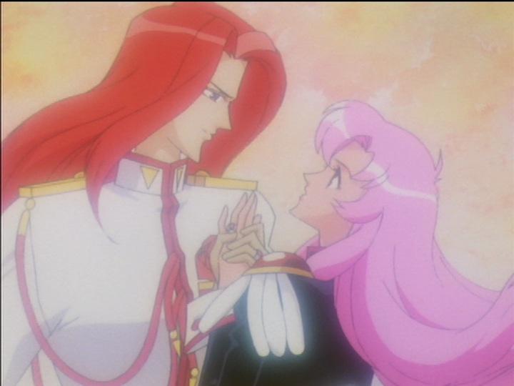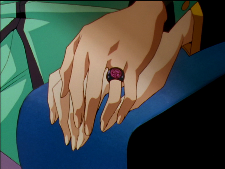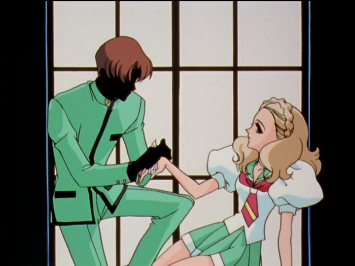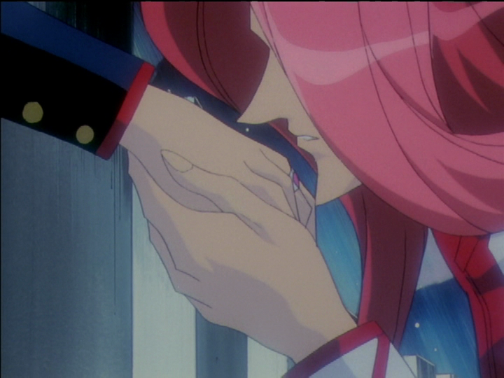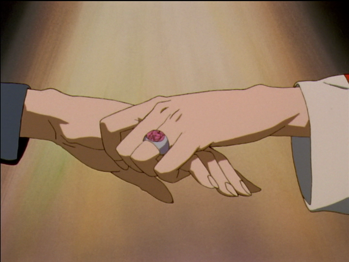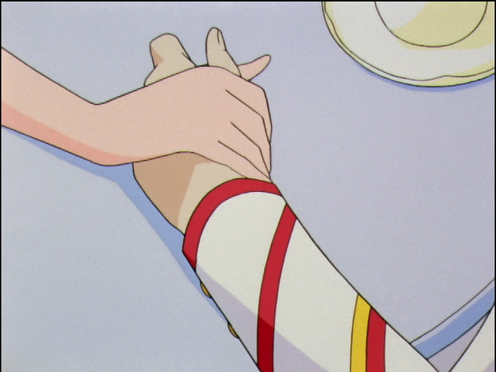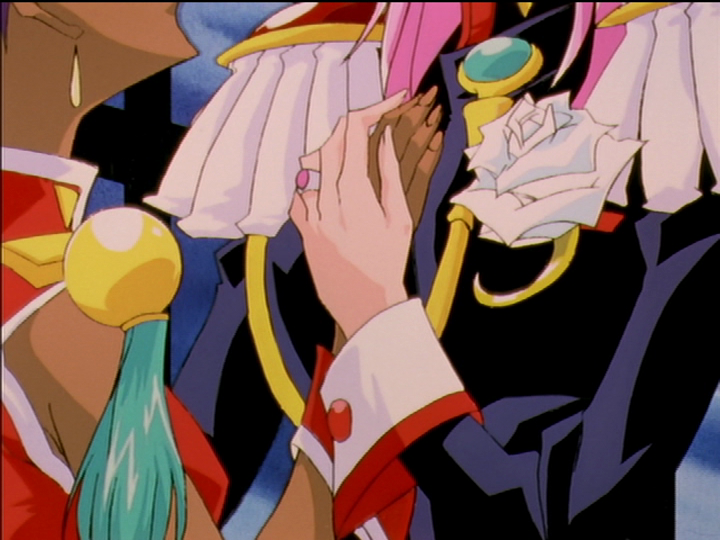 This hand touch is from when Akio verified Utena’s feelings after the First Seduction, to see how his plot was progressing. He took her hand and moved his thumb over her ring, as a prelude to trying to tempt her into a kiss. Utena kept her hand closed and declined the kiss. Contrast Touga and Utena above, where Utena opened her hand: She responded to the handholding and was ready to be kissed—and see Touga and Utena below.