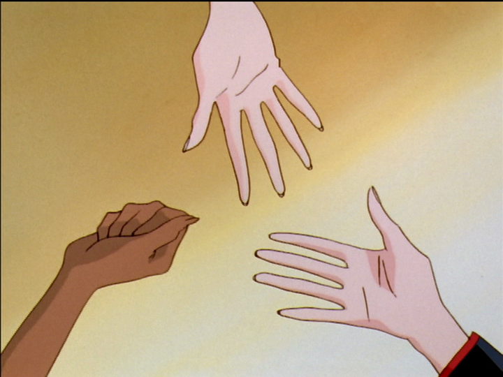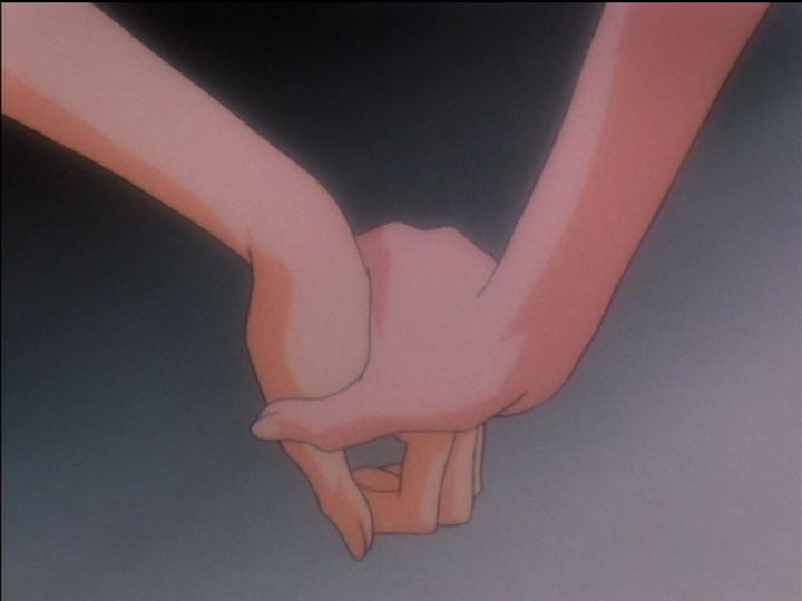 From Utena’s vision of parting hands in episode 23, below. The animation is identical to the parting hands in the opener, except that the sparkles are dimmer. The separation of the hands looks involuntary, but they make no visible attempt to hold on to each other—there is no lingering touch as in the final episode above, or as with Touga and Utena below. It looks like a cold parting.