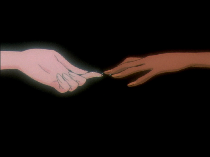 Utena wants to rescue Anthy by forcibly pulling her from her coffin, but even though Anthy reaches out it is impossible. The parting is balanced by the final photo below, which can be taken as implying that Anthy finds Utena in the outside world. Their fingers linger on each other—it is a warm parting. Both hands are left hands: Optimistic Utena believes she can save Anthy, and Anthy sees Utena as her prince.
