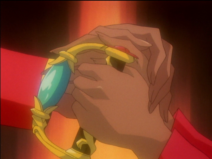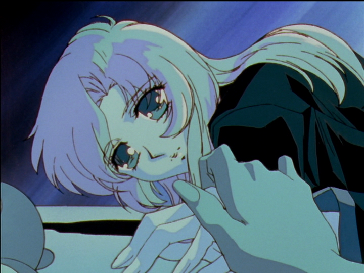As part of staging a rescue of Utena so he can appear to be her prince, Touga arranges for Utena to appear to rescue Anthy. What a complicated plan. As the castle falls and the dueling arena goes chaotic, Utena takes hold of the seemingly-unconscious Anthy’s hand. Grabbing a hand does not cause the fingers to splay like that (try it). Anthy is not spreading her fingers, so it’s poetic license.