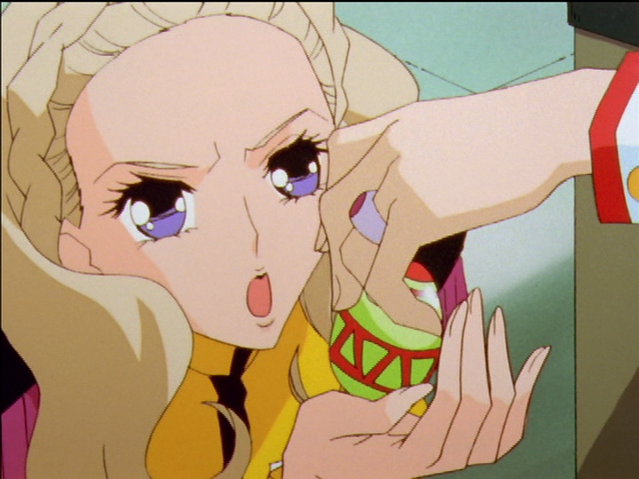 Nanami takes Anthy’s hand to lead her to the dance floor. Anthy goes along with it. When there, Nanami lets go and abandons her. Appreciate Nanami’s villain costume! At close to the same time, Touga takes Utena by the wrist in the hope of leading her to the dance floor and staying there with her. Utena pulls free.