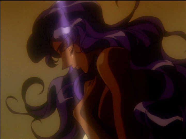 Juri, pressed against a wall and with captured hands, is nearly helpless. The only defense she can find is to bite him on the lip. The sexual assault has a parallel in the sex scene from the First Seduction, which is also a sexual assault (though Utena does not realize it). Akio holds one of Utena’s hands—see the episode 33 image on the right above. He’s likely holding both hands and pressing Utena down against the futon, leaving her nearly helpless. Utena is flat on her back and defeated, while Juri is standing and still has a little scope to fight back.