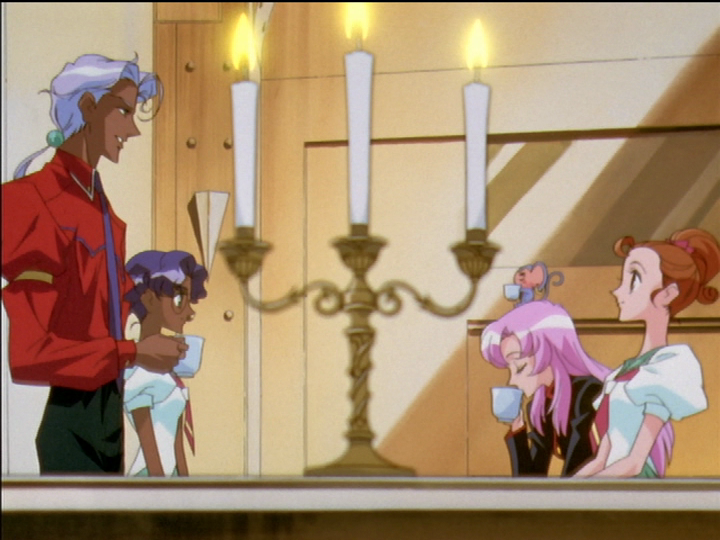 The cake is not a birthday cake, but the candles are birthday candles. When Utena has blown them all out, she will be granted her birthday wish. She wants to violate her own ideals to be with corrupt Akio—she wishes to be corrupt. In Utena, light is for moral goodness, and darkness is for evil. When the candles no longer give light, she has chosen to become corrupt. When she blows out the last candle, she lies to herself. It is her first deliberate falsehood in the series. The candles tell us how Utena sees herself—they show what, in the moment, she most wishes for.