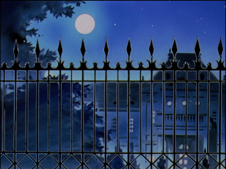 Two Miki and Kozue episodes. The moon stands over the Kaoru family house—which is enclosed by a fence that metaphorically imprisons the siblings with each other. It is the cage of family, one form of the “cage of memories” from the episode 1 duel song. Compare the bird cage that the Kaoru family mother metaphorically escapes from. In episode 15, when Kozue fought a duel to kill Miki’s love Anthy, the moon’s face resembles a skull (compare it to other moons on the page).