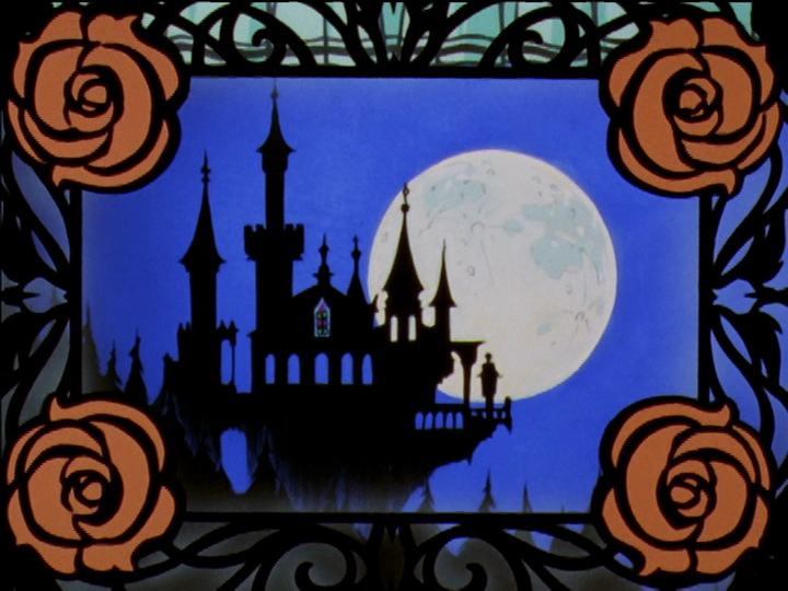 On the castle, note the stained glass window, like the stained glass of the church and the Academy itself. And the row of arched windows under a round cupola, like Akio’s tower. The design is similar in feeling to the inverted castle in the sky, with a lot of towers. The blue-green across the top is the bottom of the theater curtain that lifts at the beginning of the prince story, still lifting. The camera pans down from the silhouetted castle to a dark place below where Wakaba’s prince is, the same way it pans down from Nemuro Memorial Hall to the black rose below. Wakaba’s fantasy prince lives in the underworld; he’s metaphorically dead—like Dios—and Wakaba is there with him—like little Utena in the coffin. The brown roses are dead. Utena shows signs from early on that she is stirring in her coffin. It’s Utena’s story, and at this point Wakaba shows only faint signs that she will follow Utena.