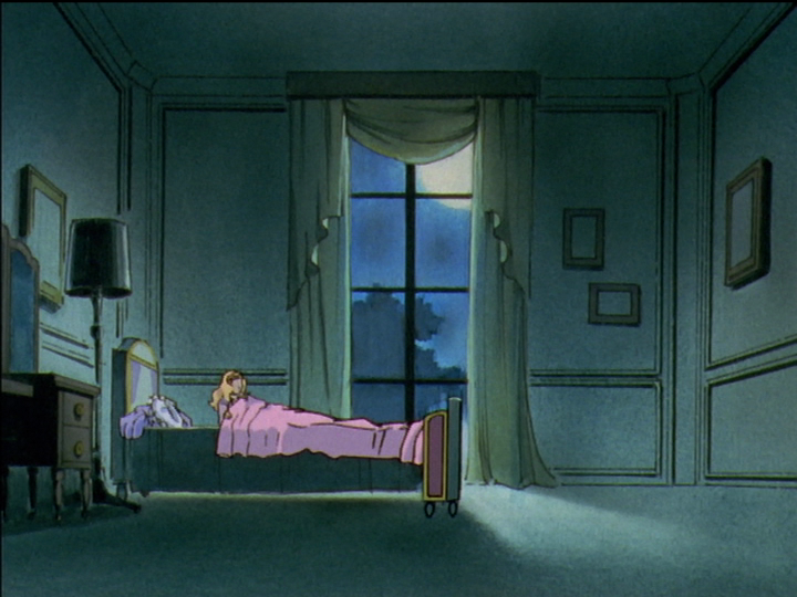 Nanami’s bed at night. Nanami is about to wake up and stop Touga from practicing sword swings. White sunbeams stand for the prince. Because they shine to the left, the moonbeams seem to stand for Touga, Nanami’s prince, who seeks to be like Akio. Touga is preparing for the episode 11 duel, where he pretends to be Utena’s prince. The beams could stand for Akio directly, since he is the moon and is false.