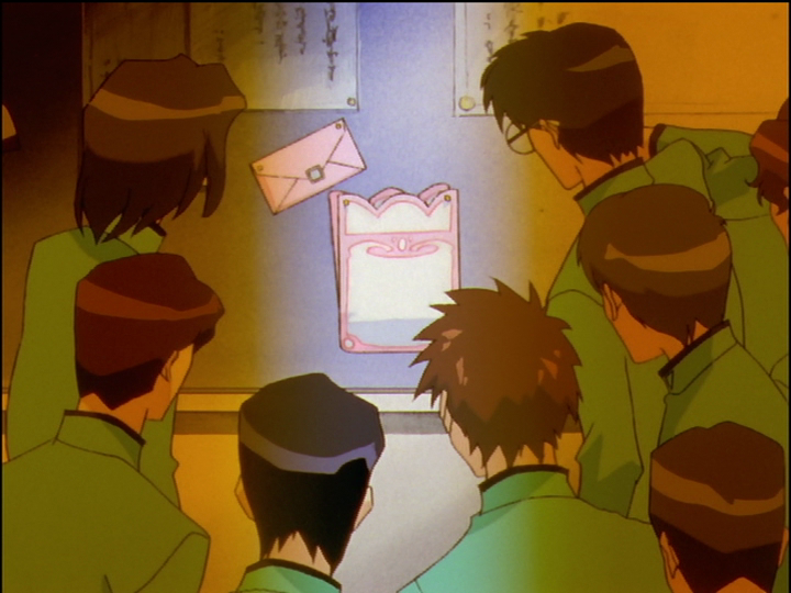 In episode 3 Nanako faces jealousy over her selection for the Sorority. And not in a small way—Misaki Aya was passed over and creates an organized campaign to discredit Nanako. Nanako has a stepfather (making her a bit like Utena, without her real father), and Misaki posts an announcement on the bulletin board to malign her parentage, drawing a crowd. Utena riffs on the scene: Wakaba’s posted love letter is a similar attack on Wakaba, and sets off plot events in a similar way. In the picture, Nanako and her new friend Mariko come across the crowd and wonder what’s going on, the same way Utena and Wakaba do. Nanako runs away and Mariko follows, as in Utena. Kaoru no Kimi, a prince of the school and nicknamed after a prince, tears the announcement from the board.