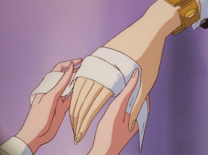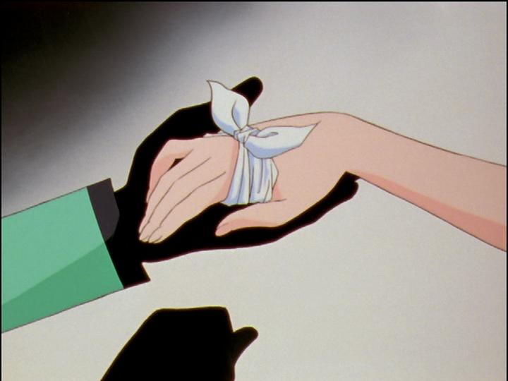 It might be one inspiration for Utena’s handkerchief bandages (see hand catalog - bandages), which are injuries deliberately inflicted, or at least accepted as part of the deal, and “treated” by the one who caused them, while the victim takes the treatment to be sincere.