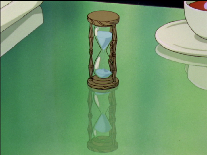 The clock shows two minutes past noon—or midnight. The lighting suggests noon at the top and left versus night at the right and bottom, with the warm light of joy and the cool light of sorrow. The clock’s reflection can only remind me of the reflected hourglass and Utena’s time reversals.