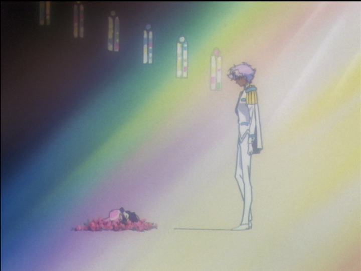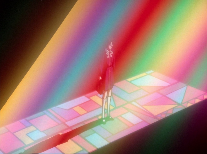 Stained glass. On the left, Nanako is illuminated in red, a symbolic color in the show, and surrounded by other colors. Life is varied and colorful. On the right, Dios is struck by white light, and a ray of purple that goes through his head expands to illuminate Utena. Akio pretends to be pure Dios but transmits toxic ideas. Utena is surrounded largely by yellow for her envy of the prince. But a bit of white gets through to her too.