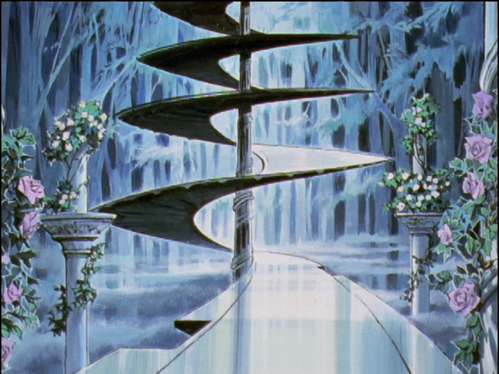In the opening animation, we’re treated to a shot of Akio’s tower in the left half of the frame moving toward the center, as the camera moves left. It turns out to be a consistent symbol: When the tower is moving to the right due to a camera move to the left, it means Akio’s power or closeness is increasing. The tower does not pass the center. When the tower is moving to the left, his power is decreasing. The Cinderella scene in episode 30 makes it easy to follow. The tower follows a particularly complicated path around the left side of the frame after Akio and Utena return from the Routine Date and park under the tower, episode 37. In the Ruka episodes, it tells us Ruka’s power over Shiori or Juri.