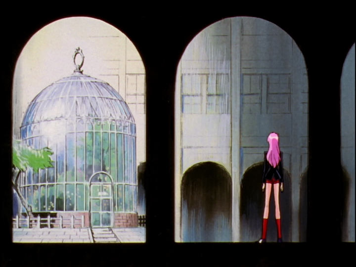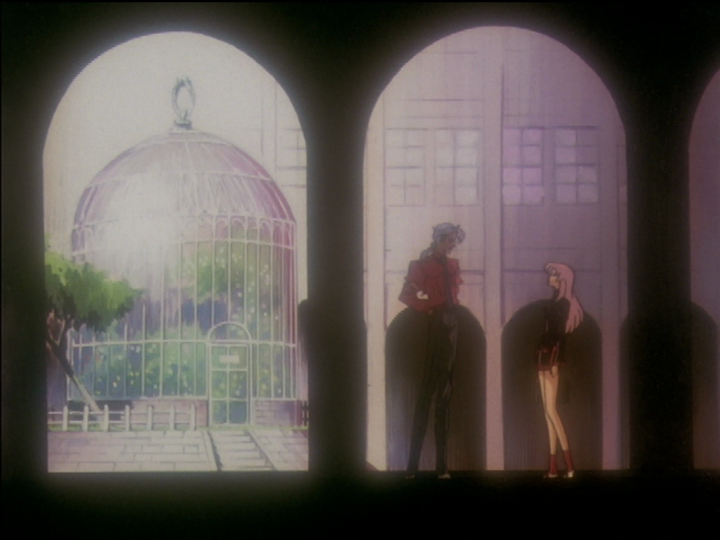 Character height reflects male power (see above). On the left, Utena sees Anthy’s greenhouse for the first time. The small and large dark arches say that she is partly trapped and partly free. Her hair is ordinary-girl length and her voice is, I judge, halfway between boyish and girlish. Approaching Anthy’s world, and/or being reminded of her prince, made her more girlish than she was when boyishly playing basketball. On the right, in romantic soft focus with a purple background where Utena grows corrupt, Akio (also partly trapped) tells her that she is a close friend, and Utena’s voice is soft and entirely girlish. The camera has been moved upward, but not enough to foreshorten the characters. Nevertheless, Utena looks shorter by a head. Being more trapped and more girlish reduced her height.