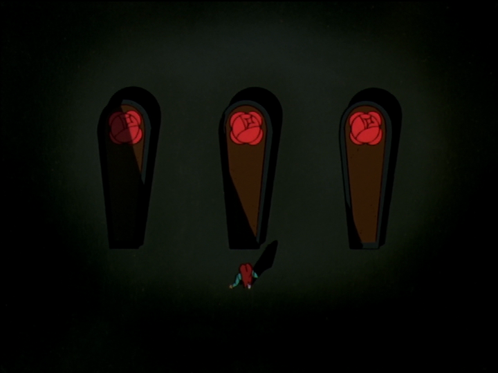 Utena is full of diagonal lines, dark on one side and light on the other. Often the line is the edge of a shadow. On the left, little Utena is in the leftmost coffin, on the dark side of the shadow line. After young Touga opens the coffin, Utena in the same place is in the light. Sometimes, as on the right, the line is not consistently explained by the setting. Juri is on the dark side, lying to Ruka that Shiori is only an old friend. She seems to have teleported underneath one of the diagonal beams in the setting for just long enough to tell the lie. (Juri is facing away from Ruka, an anime convention when lying, and her eyes are out of sight because she does not want to see her own misdeed. Her right hand on her locket tells her true feelings.)