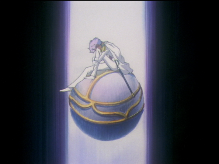 Eggs hang in a web of meanings. Eggs are female, not only biologically but in Utena’s symbolism that round and curved objects are female. The prince sitting on the egg of the world is a reference to The Little Prince, who has to take drastic measures to leave the Earth. It also recalls a bird sitting on its egg; it stands for nurturing—Dios’s purpose, and the Academy’s purpose, is to teach sex roles to children. Ohtori Academy is supposed to nurture its students, but doesn’t really. In the Student Council’s ritual chant, we must break the shell of the egg—revolutionize the world—or we will die and remain in our coffins. The egg of the world is borrowed from Demian. Akio claims that the egg of the world is the grave of the prince—the prince failed to break the shell. Inside the egg is Ohtori Academy, the world of illusions where students develop; outside is the real world they must hatch into as adults if they are to live. It’s direct: To be in the egg is to be in your coffin; maturing means leaving your coffin. During the Student Council ritual, we see birds flying by outside. They hatched from eggs and stand for freedom in the outside world, and yet the name of the academy is Ohtori Academy—ohtori literally means big bird, and it has a specific meaning which implies that Akio rules over all birds, so the flying birds also stand for being trapped in your egg. You may believe you have hatched into the world when you have not. The egg is one of a range of symbols of Utena’s final victory.