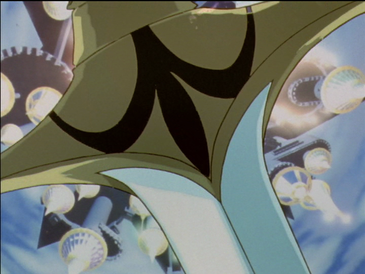 Two: They refer to the three-point eye symbol of ancient Atlantis in Nadia. The image with three spikes of shadow refers to this specifically. Ancient Atlantis was powerful, but is destroyed and gone—left behind—and corresponds to Dios. The three points contrast with the four points of evil Neo Atlantis, which corresponds to Akio. For more on the four points, see comparisons - four points.