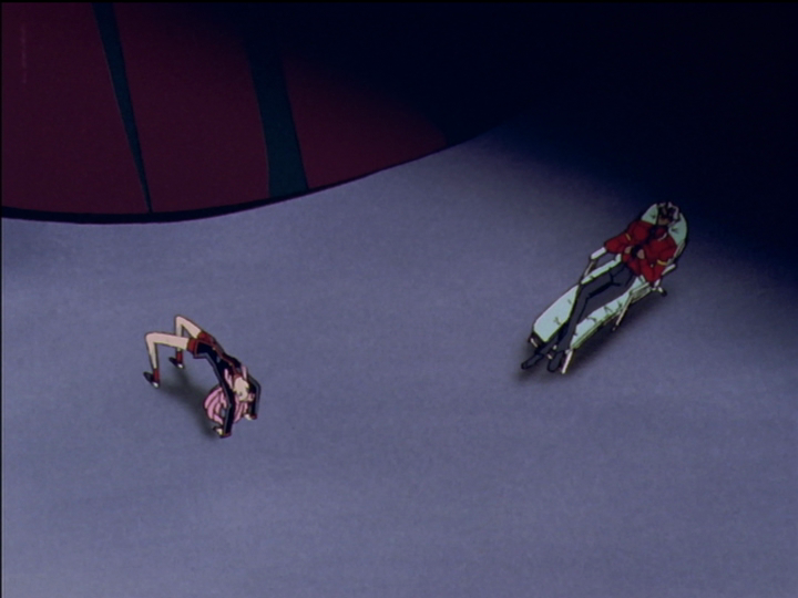 Nanami runs. Nanami is associated with running. It symbolizes how she rushes to wrong conclusions, but it still fits with the bigger transportation metaphor. As a powerful girl from a wealthy family, she has freedom that others do not—she runs—but she is also insulated from realities that others must face—she runs when she should not, doing things like slipping on Chu-Chu’s banana peels, charging Utena as a cow, and colliding with Juri in episode 27. Others generally run for reasons that make more sense but are nevertheless illusion-bound, like Utena running after Wakaba in episode 1, and Shiori running to meet Ruka.