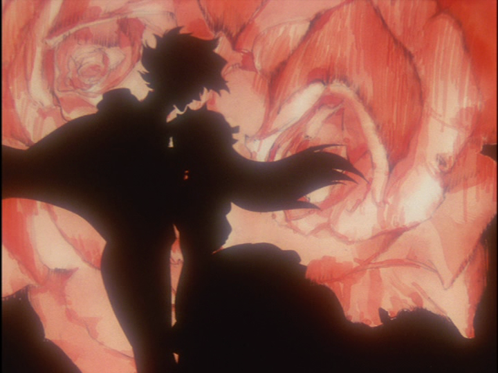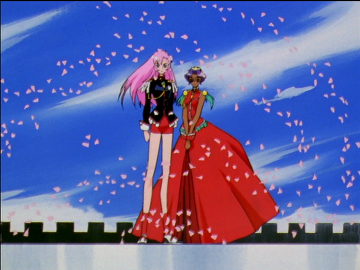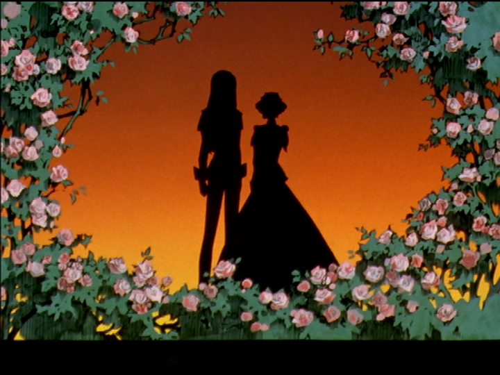 A more convincing reading. I think it’s most natural to read the images as the story of Anthy and Utena at the Academy. Anthy starts out playing the role of a student. She falls in love with Utena and outgrows the role. In this reading, the orange sunset is easy to interpret: It is the orange of one-sided love. After Akio’s manipulations, they still love each other but each believes the other has turned away. (Anthy’s belief that Utena has turned to Akio is well-founded, while Utena’s belief that Anthy has betrayed her is false. It’s one of the ways that Anthy and Utena are opposite. It reverses in the final showdown: Anthy betrays Utena and Utena is loyal to Anthy.) The scattered roses represent Utena’s defeat and death in the final showdown. The final showdown itself has a different ending to this sequence, with a different meaning.