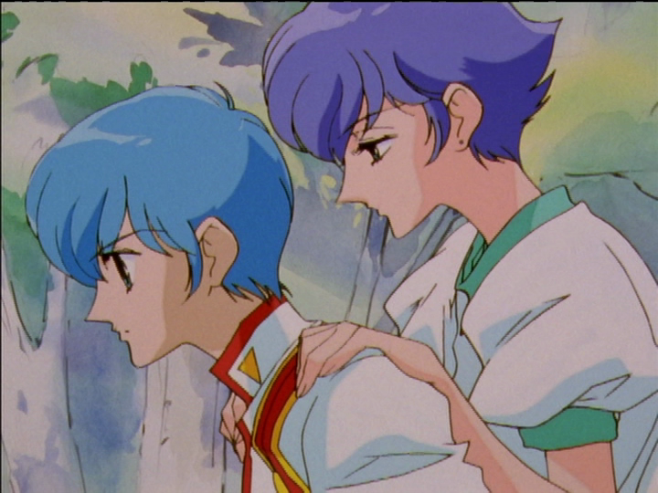 In episode 2, Saionji, angry that Anthy will not obey him, has his hands on her shoulders. After he slaps Anthy to the ground, Utena appears, angry at Saionji. She kneels over Anthy protectively.