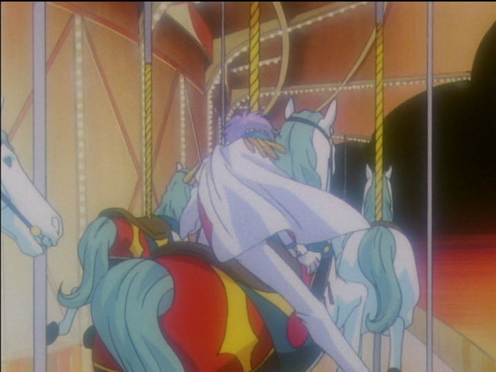 More examples: When walking to the “Tale of the Rose” shadow play in episode 34, the turns shown are left turns. In the final episode, Dios rides a merry-go-round which turns counterclockwise. He mounts the merry-go-round as he leaves Utena collapsed on the floor, and it seems poised to carry him out of sight, back to the fantasy of his past. Light coming from left of frame indicates illusion in the final photo at the end of the series (and at other times).