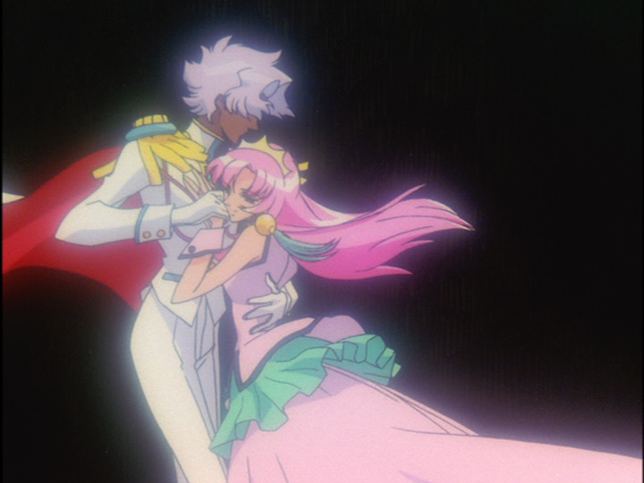 When Utena is being a princess, or sees herself as a princess, her hair reaches to her butt. After looking toward the castle in the sky in episode 9, her hair is at first ordinary girl length. When Touga grabs her, it is princess length; when she frees herself, it shortens to prince length. In a reversal, in episode 12 when Utena is trying to be an ordinary girl, most of the time her hair is prince length—she misunderstands herself. It returns to ordinary girl length when she kisses Wakaba on the forehead; Utena is girlish when doing anything yuri. In the Second Seduction, after Akio tells her she is like a princess (see the brief discussion there), her hair shifts abruptly from ordinary-girl length to princess length. In the Final Showdown after Akio draws her sword, she is a princess in a crown and princess dress and her hair is princess length.