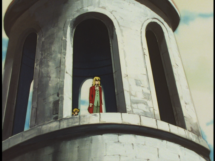 Utena looking out of, or leaning out of an open window shows her freedom. When we see her through a closed window, as at the end of episode 30, she is not free. The huge windows in Akio’s tower do not have glass—and he has solid barriers that he can close when he wishes. He is free to deny freedom to others.