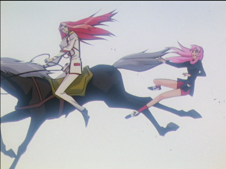 Touga’s hair and the horse’s tail are rough mirror images of Utena’s hair, which is ordinary girl-length. It recalls the wind blowing both ways at once in the ending credits. Besides that, see a comparison with Nanami falling.