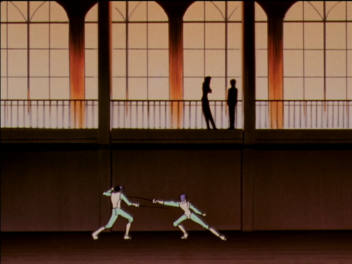 As they discuss above, below them two fencing club members fight a practice match, a boy and a girl. The girl wins the match. It seems to contradict what Juri said: Utena can be girlish and win; she does not need to be a prince. After all, Juri and Miki are inside a symbolic cage formed by the window panes, and Utena is outside it. But there are multiple ways to read the foreshadowing. Utena does defeat Touga, and you can stop there. We the audience do not yet know how much work Akio will put into undermining Utena before the final showdown, and we don’t know that there is a Revolution duel yet to come (we were told that the duel with Touga will be the last). Or you can continue: Utena does return to being a prince, and Anthy backstabs her for it. Utena as a boy loses the Revolution duel to a girl. Or we can continue to the very end and say that Utena does win the final showdown.