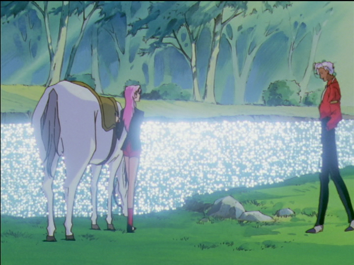 In riding through the forest, Akio says nothing. Touga rode (as it turned out) dangerously fast; Akio at a safe but still exciting canter. The excitement of the ride is to cue sex, parallel with the excitement of amusement park rides. Sure enough, when they arrive at the pond Utena agrees it was exciting and her heart is beating fast, just as in the hotel she enthused about her fun at the amusement park. After arriving, Akio withdraws according to plan, just as he withdrew after they arrived at the hotel room in the First Seduction. Utena stays with the horse that she is now comfortable with and has been cued to see as meaning Akio and sex, while Akio moves away a distance (the withdrawal step) and sits under a tree. His cues become more direct.