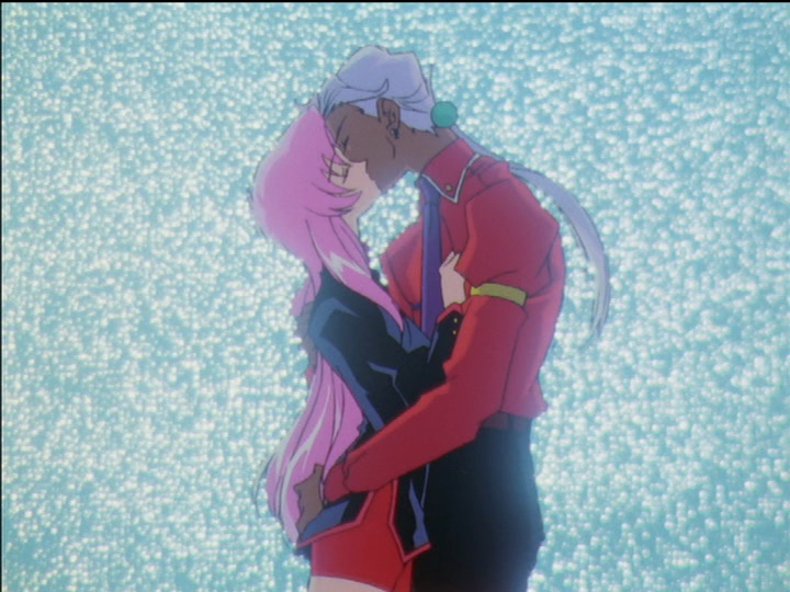 Akio strikes. He walks closer, reversing his withdrawal. It is parallel to the end of the othello game in the First Seduction, where’s it’s subtly indicated that Akio leaned forward toward Utena. He tells her she’s like a princess—that she already is what he wants her to be. (He uses the word oujo, royal princess; she is suitable to marry him, the monarch.) Her blush is deeper. In a soft girlish tone she suggests he is insincere. In her Cinderella scene, Utena recognized Akio as a bad boy and was attracted anyway; her resistance this time is weaker yet. He obliterates her objection by insisting that he spoke truly. Repeating a lie is strangely effective in real life too. A blue-green background says that Akio’s power of illusions is operating. She takes the initiative as she has been cued to, and closes the distance to kiss him. Her hand is on his chest, which in Utena indicates desire (see all the girls with their hands on Touga’s chest). He holds her in place with his right hand (he truly seeks to restrain her), and puts his left hand intimately and suggestively on her butt (he lies that he desires sex). Just in case the earlier cues were not enough, pressure on her butt in that position will send her a tangible message.