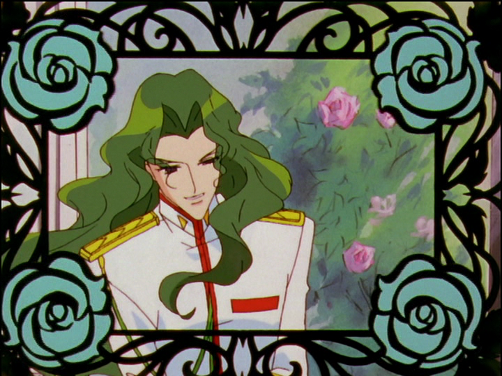 • Episode 20. Saionji returns to the Academy. He walks into the great dome in a callback to Utena’s introduction in episode 1. He gets the admiring upward pan. He remains in spinning roses through two shots of his smiling face as he waves to his fans. In the second and final one, the roses are lighter have shifted color to blue-green. It’s partly visual, to contrast with his dark green hair, but it must be meaningful too.