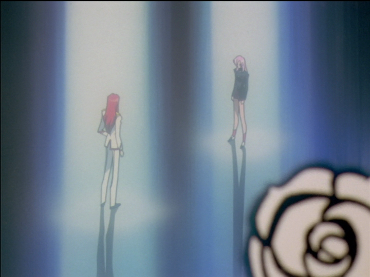 • Episode 36. In the gondola with Touga, riding to the dueling arena, Touga grabs Utena in his arms, rather like in episode 9 (though we only see their feet). She gets pink spinning roses. Like episode 9, she objects. Unlike episode 9, Touga does not get white spinning roses. I think Utena remembers him fondly, but has long since given up on seeing him as her prince. But see the white spinning roses for Touga and Saionji a little later in the episode, which may say otherwise.