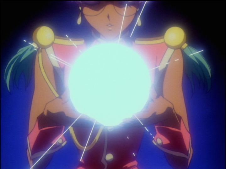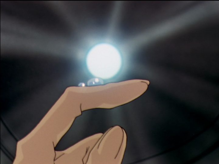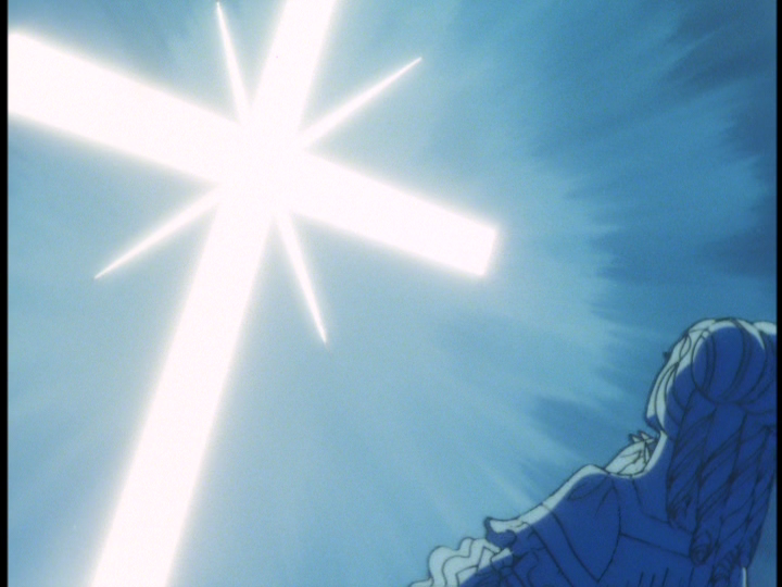 I found three similar anime scenes. In Sailor Moon SuperS, there’s a flashy lighting effect when Pegasus (the flying dream unicorn that corresponds to Dios, who is the sun) appears in the sky. Chibi-Usa calls down Pegasus with a short prayer, and Pegasus provides help in the form of power to defeat the monster of the week. In The Rose of Versailles, Marie Antoinette prays to a Christian cross shining like the sun in the sky. She is calling on God for help. In The Vision of Escaflowne, protagonist Hitomi dreams of reaching toward a sun with six rays. The sun resolves into an angel that flies down to rescue her, prefiguring an actual rescue later in the episode. Hitomi is also reaching out for help. The second two, and maybe all three, associate the sun with the Christian God and imply that God can give salvation, whether theological or literal. They connect with Dios’s rescues, since Dios is the sun.