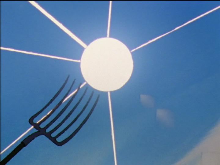 The solid sun rays are similar to the indrawn rays of illusion when a sword is pulled from a duelist’s chest in the arena. The ball of light when a sword is drawn in the arena is Dios as the sun. Throwing the pitchfork (which Utena uses like a sword) across the sun corresponds to drawing a sword from a heart. That’s an important part of the meaning, but there is more to it.
