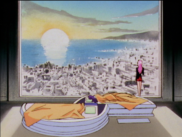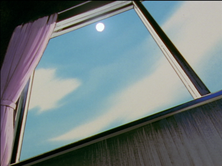 Episode 37. It is after Utena saw Anthy and Akio together. We don’t see the sun—information is being withheld from us—but Utena did, and she remembers part of the prince story. It’s a miracle. Utena is enlightened. She doesn’t understand much at first, but she begins to look around outside her coffin and learns rapidly. It’s a key event, and a necessary step in Utena’s victory. Though the camera is lower and we should see less of the city, in fact we see more of it and it seems closer and clearer. Utena is seeing more, and seeing more clearly. The sunbeams are angled left, as usual with Utena, and she stands on the left side of the frame. One-sided love: Utena believes that neither Akio nor Anthy loves her, even as she loves both.