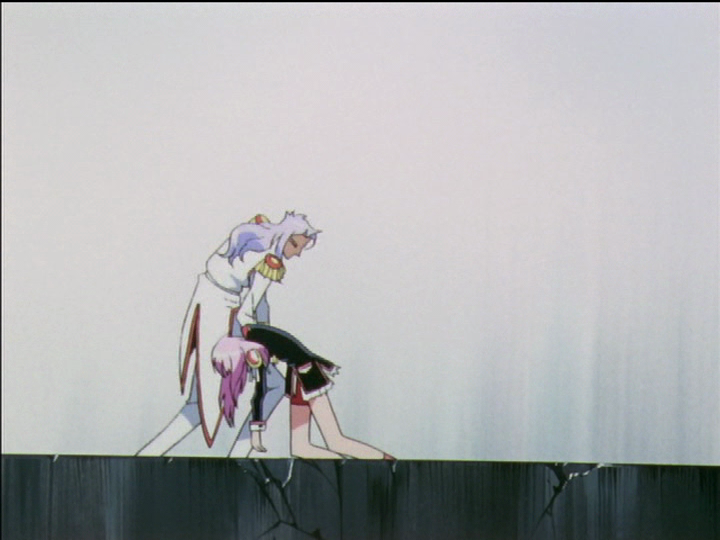 • Accidental groping. When the badly injured Utena falls on the path to the Rose Gate, Akio catches her by the chest. It fulfills most of the conditions of the accidental groping trope: Akio had no real choice about where his arm went when catching her, his arm lingers in place as he lifts Utena, and Utena rejects him, pushing him away by the face. But it plays out differently. Akio’s arm lingers for the mechanical reason of lifting Utena. Neither seems to see it as particularly sexual. Utena rejects him not as a groper but as Anthy’s abuser.