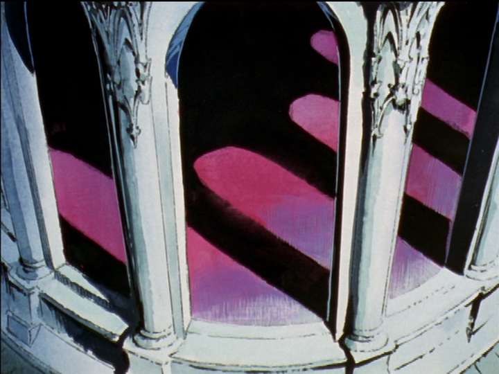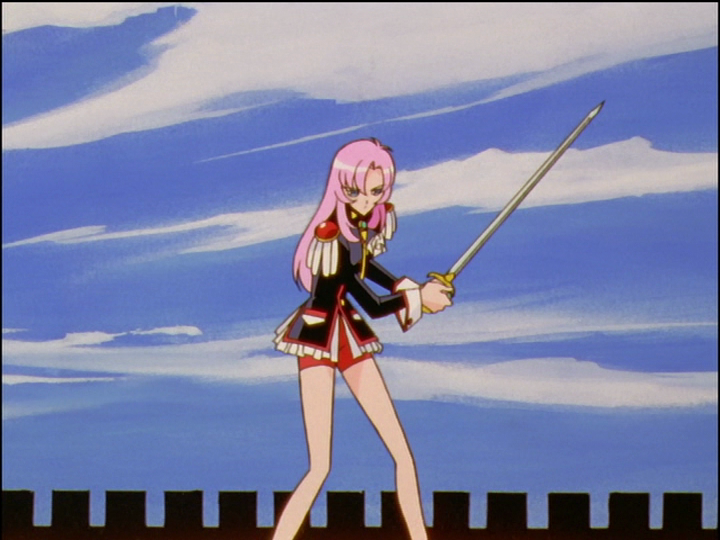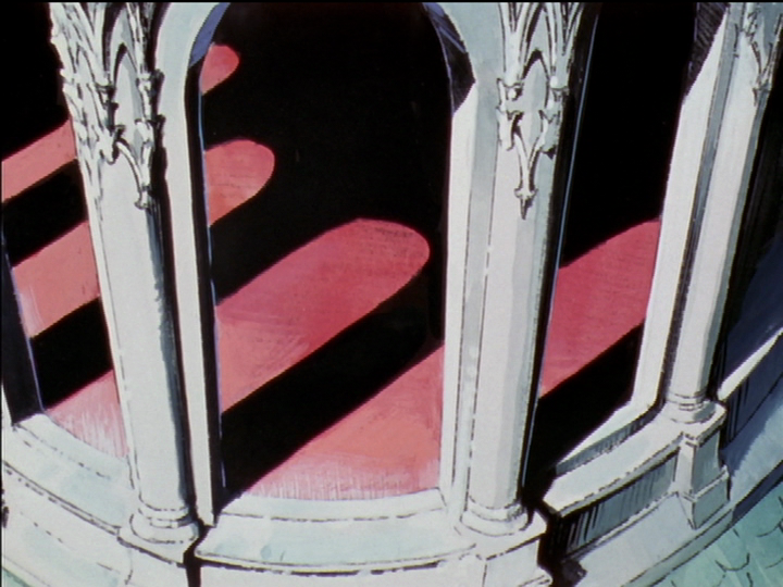 From the duel of episode 2. The still picture can’t show it, but the crenelations in the background are moving from left to right in the animation. Utena is standing in place and the camera is too. Our angle on Utena does not change, and the clouds in the background are fixed. If the camera were moving, the clouds and crenelations would both shift. When Saionji charges toward Utena, the crenelations are moving right to left. Utena is standing, Saionji is running in a straight line toward her, the camera is in between them—and the dueling arena is rotating around them, or at least the crenelations around its edge are. It rotates clockwise when we see Utena and counterclockwise when we see Saionji.