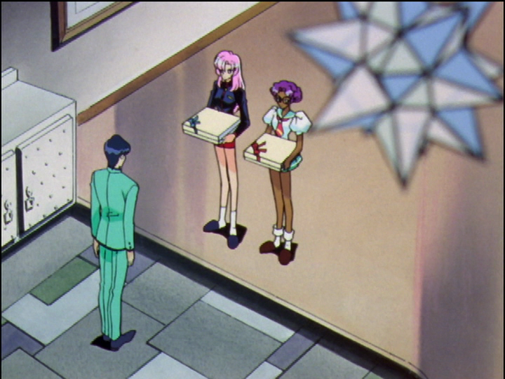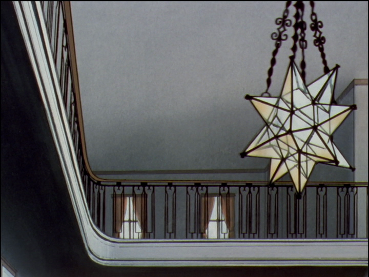 A Moravian star hangs in the dorm. It announces the birth of Utena as prince; see mysteries - geometric object (the mystery is solved). The camera is positioned to place the star next to Utena and Anthy as they receive the party dresses from Touga and Nanami (respectively).
