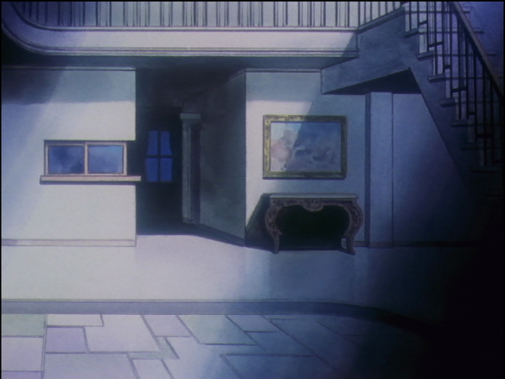 In these two views of the dorm lobby, the layout is basically the same but the Mondrian-style floor and the wall painting to the right are different. On the left, a Dutch windmill painting. There’s also a balloon picture on the left wall. In the right image, an unrecognizable but different painting with a different frame. Also the baseboard has changed to a light color and the sliding windows are shorter for their width. The episode 4 image repeats in episode 16 with different color balance.