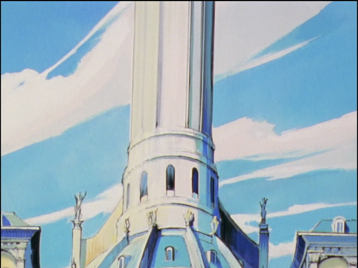 Akio’s tower changes form not only on the rear side where the Student Council platform is, but on the front side too. In episode 2 it carries a rose emblem that we don’t see again. In episode 8, the ring of multi-story windows below the long shaft has changed in design. The perspectives cannot be reconciled: If you look at the full shot in episode 8, there is no camera position where the height of the gate, the height of the pillars beyond it, and the height of the tower all match up. When the tower reappears at the end of episode 8, it is an unimportant background element and the ring of tall windows is gone.